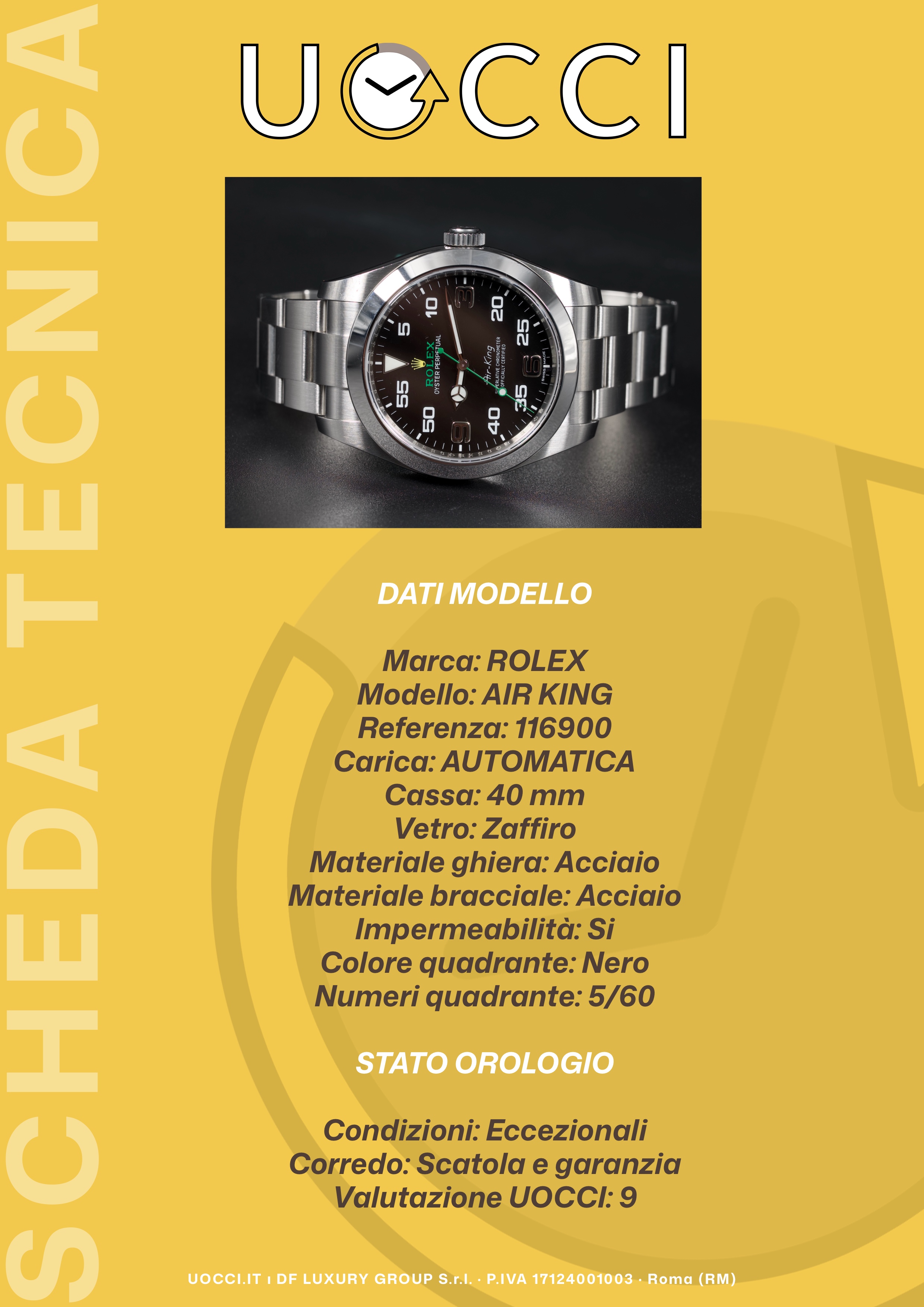 Il Rolex ref. 116900, noto come Air-King di ultima generazione, è un orologio che unisce tradizione aeronautica e spirito contemporaneo. La sua cassa in acciaio Oyster da 40 mm racchiude un quadrante nero ad alta leggibilità, caratterizzato da numeri minuti prominenti e dettagli verdi e gialli che richiamano i colori iconici del marchio. Animato da un movimento automatico di manifattura, garantisce precisione e affidabilità in ogni condizione. Sportivo ma versatile, l’Air-King 116900 si distingue per il suo carattere deciso e la sua forte identità visiva.