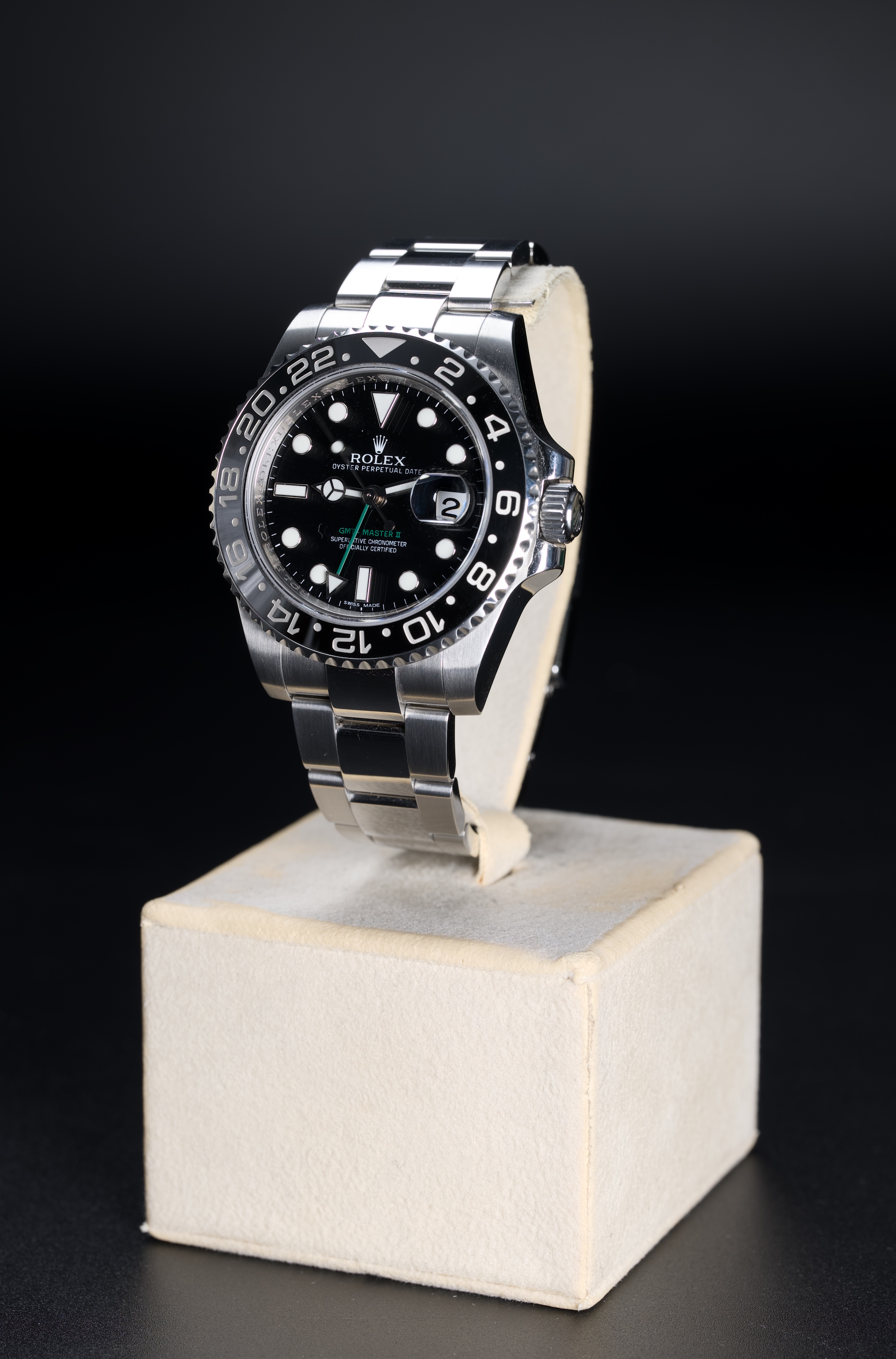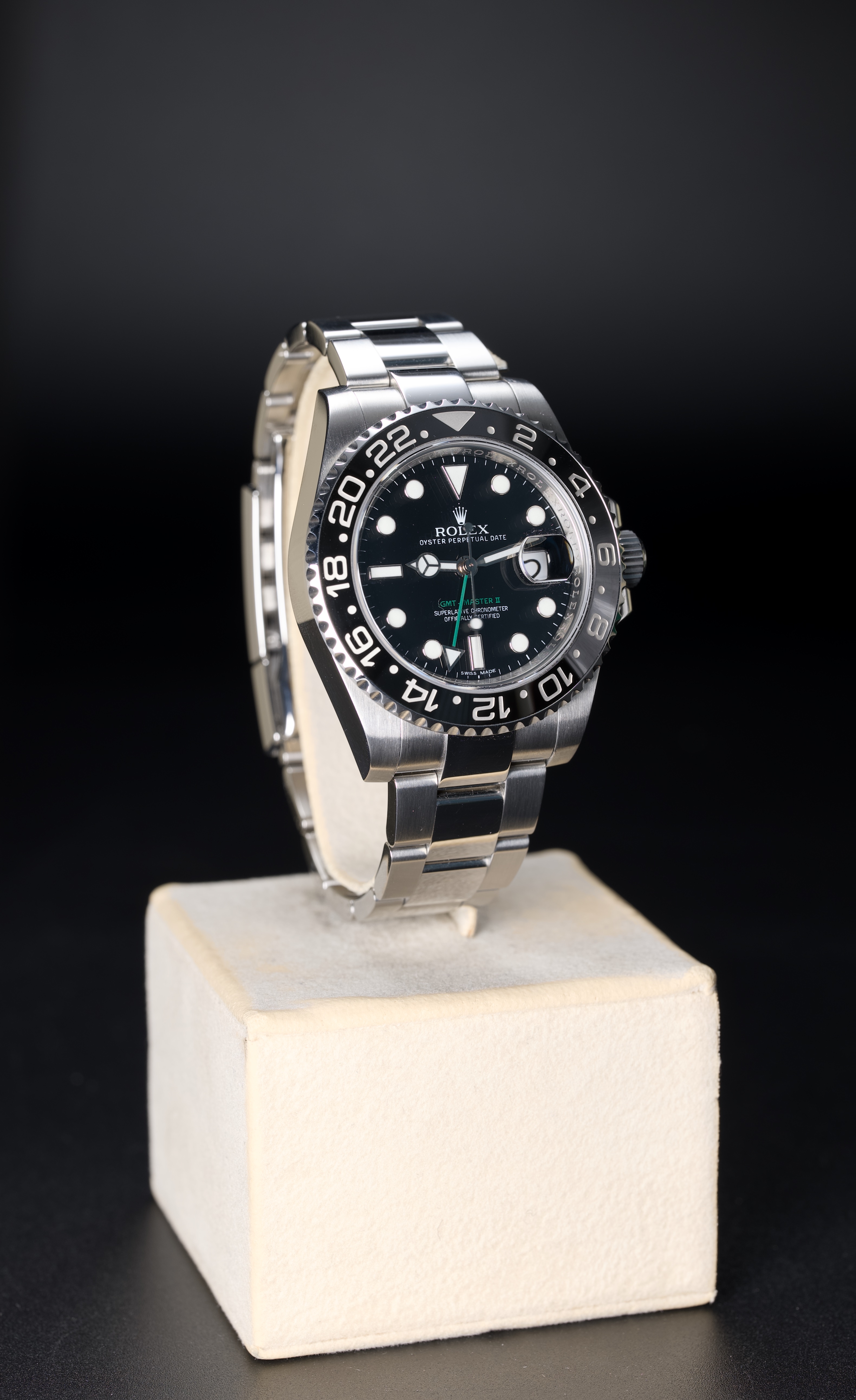 l Rolex GMT-Master II 116710LN è la notte che non dorme mai. Totalmente nero, essenziale, quasi magnetico, sembra assorbire la luce invece di rifletterla. La lunetta in ceramica lucida è come asfalto bagnato sotto i neon di una città che corre veloce, mentre il quadrante resta limpido, preciso, imperturbabile.