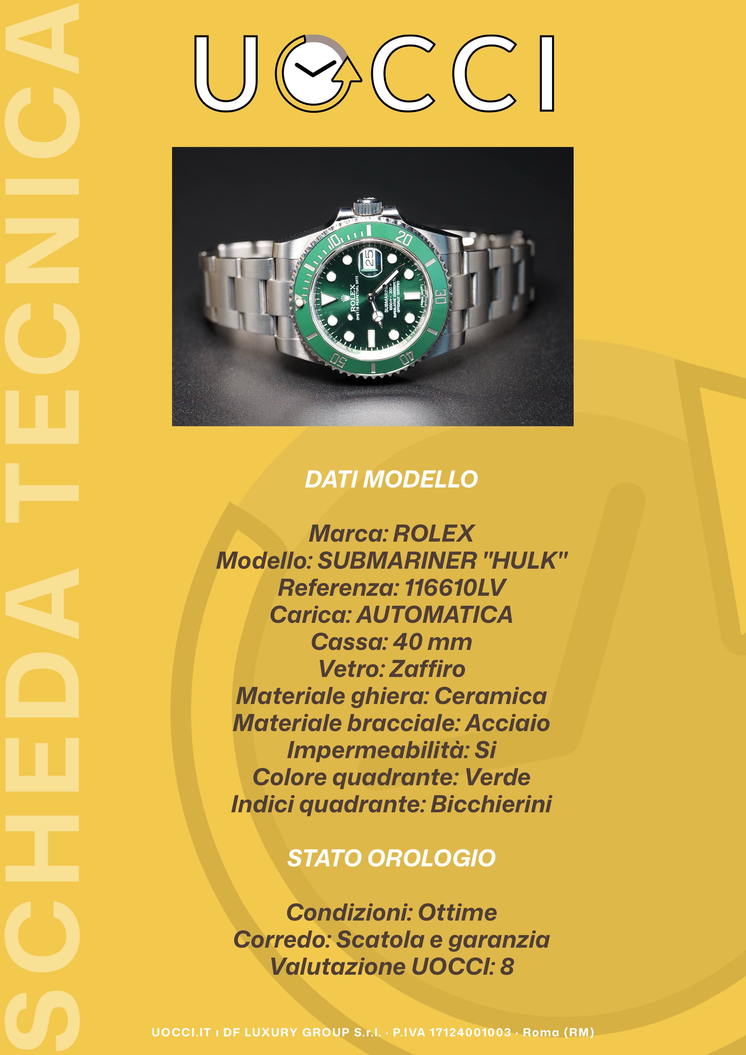 Il Rolex Submariner Date 116610LV, conosciuto come Rolex Hulk, è uno dei modelli più iconici della linea Submariner. Lanciato nel 2010, si distingue per la sua combinazione unica di quadrante verde soleil e lunetta Cerachrom verde, una scelta cromatica audace che gli è valsa il celebre soprannome. Dotato di cassa in acciaio Oyster, movimento automatico di alta precisione e bracciale con sistema Glidelock, il Hulk unisce prestazioni professionali da diver watch a un’estetica irresistibile. Fuori produzione dal 2020, è oggi uno degli orologi moderni più ricercati dai collezionisti.