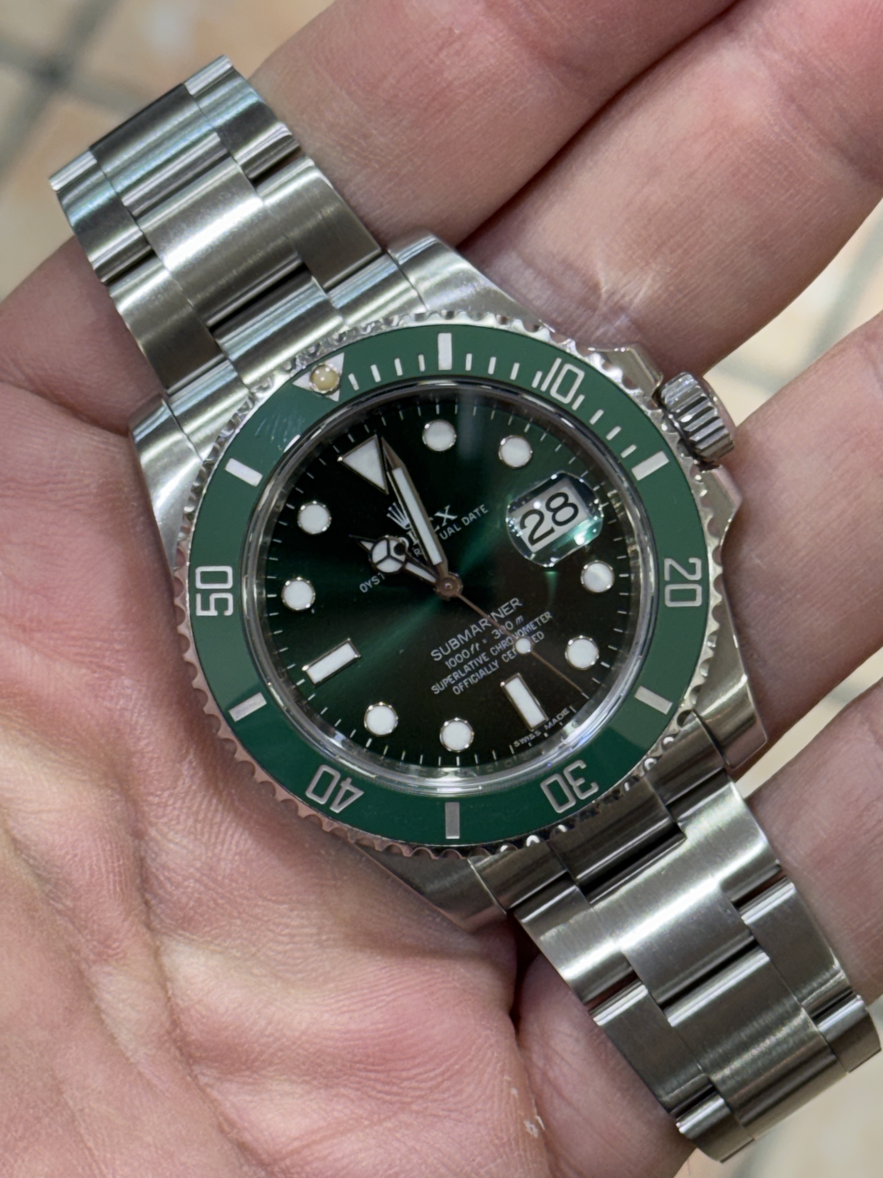 Il Rolex Submariner Date 116610LV, conosciuto come Rolex Hulk, è uno dei modelli più iconici della linea Submariner. Lanciato nel 2010, si distingue per la sua combinazione unica di quadrante verde soleil e lunetta Cerachrom verde, una scelta cromatica audace che gli è valsa il celebre soprannome. Dotato di cassa in acciaio Oyster, movimento automatico di alta precisione e bracciale con sistema Glidelock, il Hulk unisce prestazioni professionali da diver watch a un’estetica irresistibile. Fuori produzione dal 2020, è oggi uno degli orologi moderni più ricercati dai collezionisti.